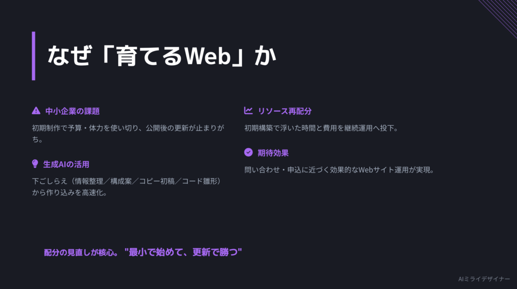 ノーコードでも自動生成でもない、“AI設計支援型”の本格スクラッチ構築。“作って終わり”から“育てて成果”へ、運用型Webの新潮流を促していきます。