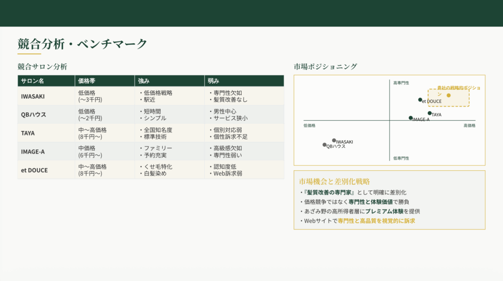 このように競合サロン分析も得意としており、ネットリサーチの上、どのゾーンを狙っていくか検討できます。