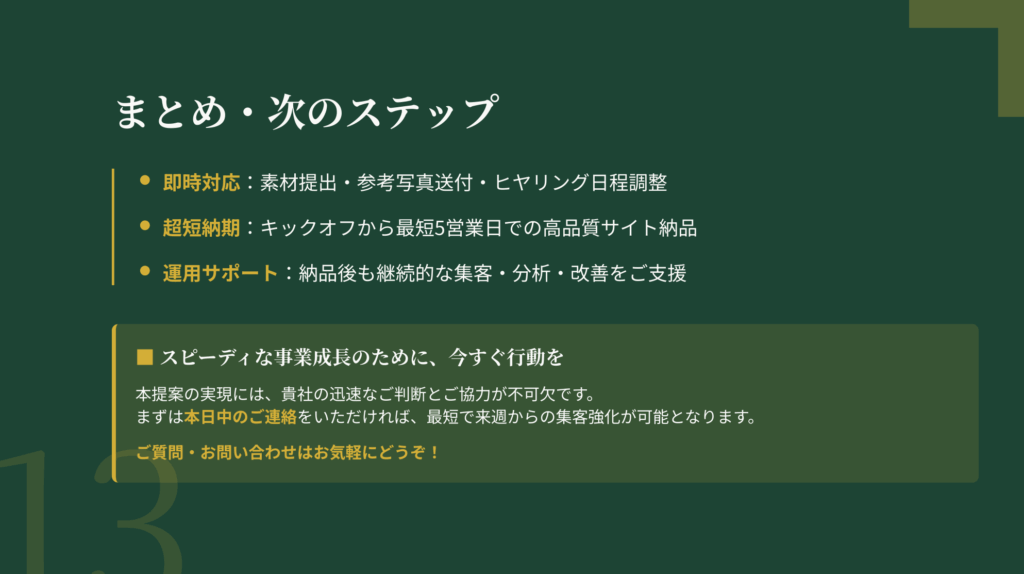 スピーディーな事業成長のためにも、次のアクションは「本日中」とお願いしております。すると来週から新規サイトで集客を開始できるからです!