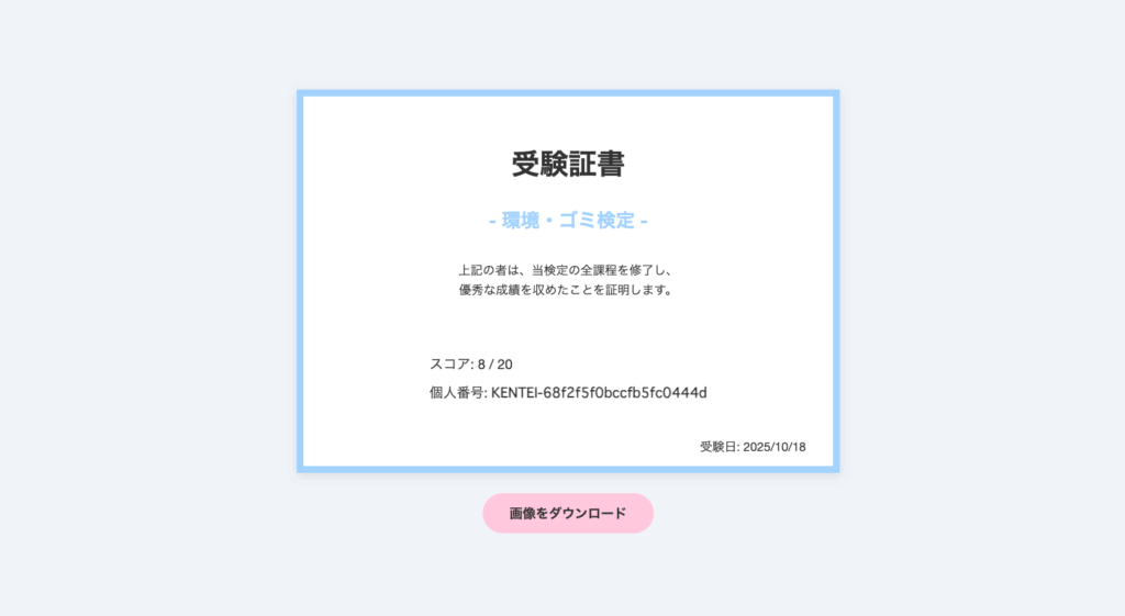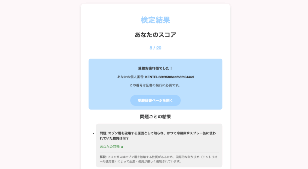 最終的に採点され、個人番号が発行され、受験証書を受け取ることが出来る仕組みになっています。